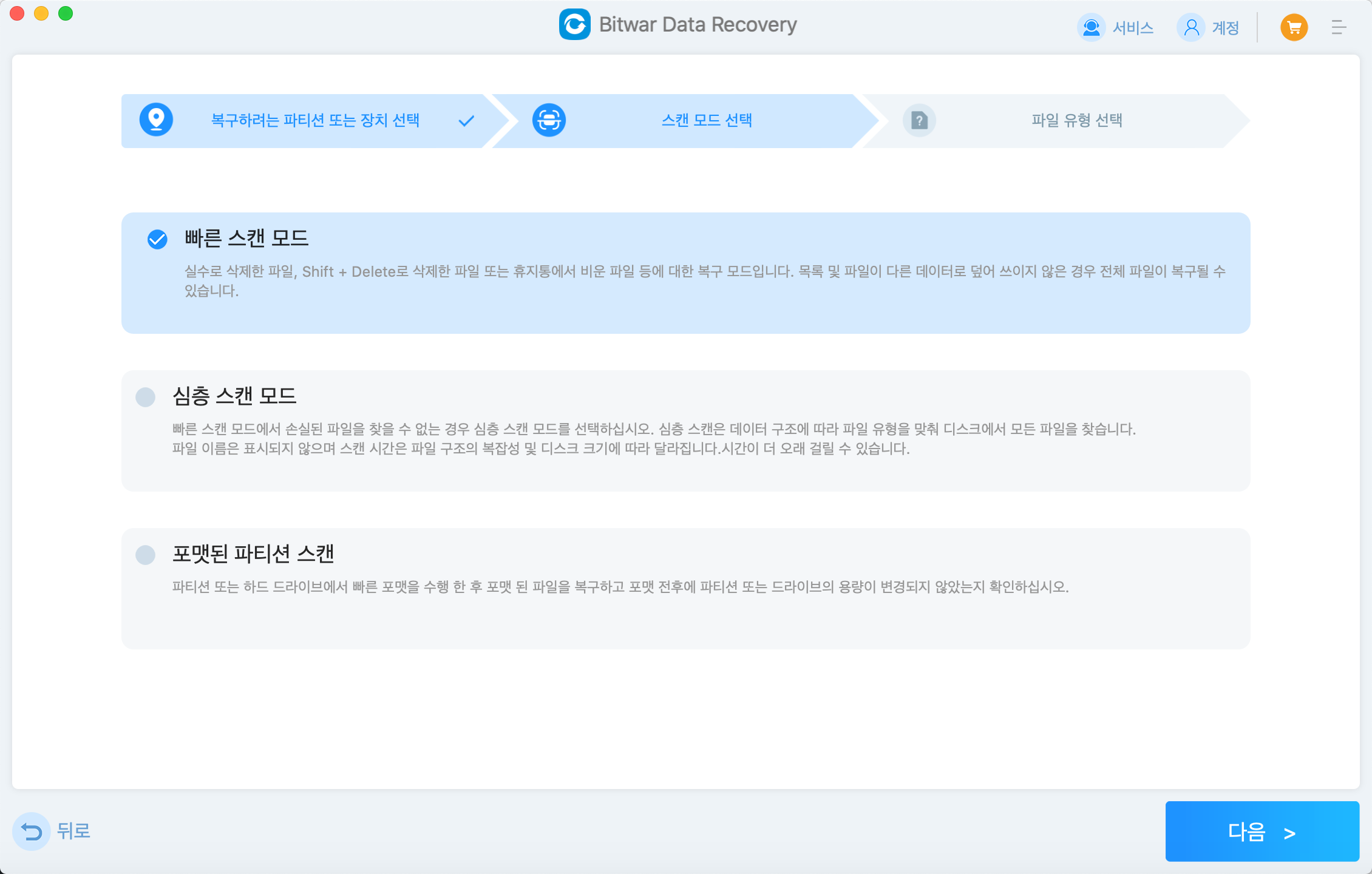 다음 단계에 따라 Mac에서 읽을 수 없는 디스크 드라이브에서 Bitwar 데이터 복구 소프트웨어를 사용하여 데이터를 복구할 수 있습니다: