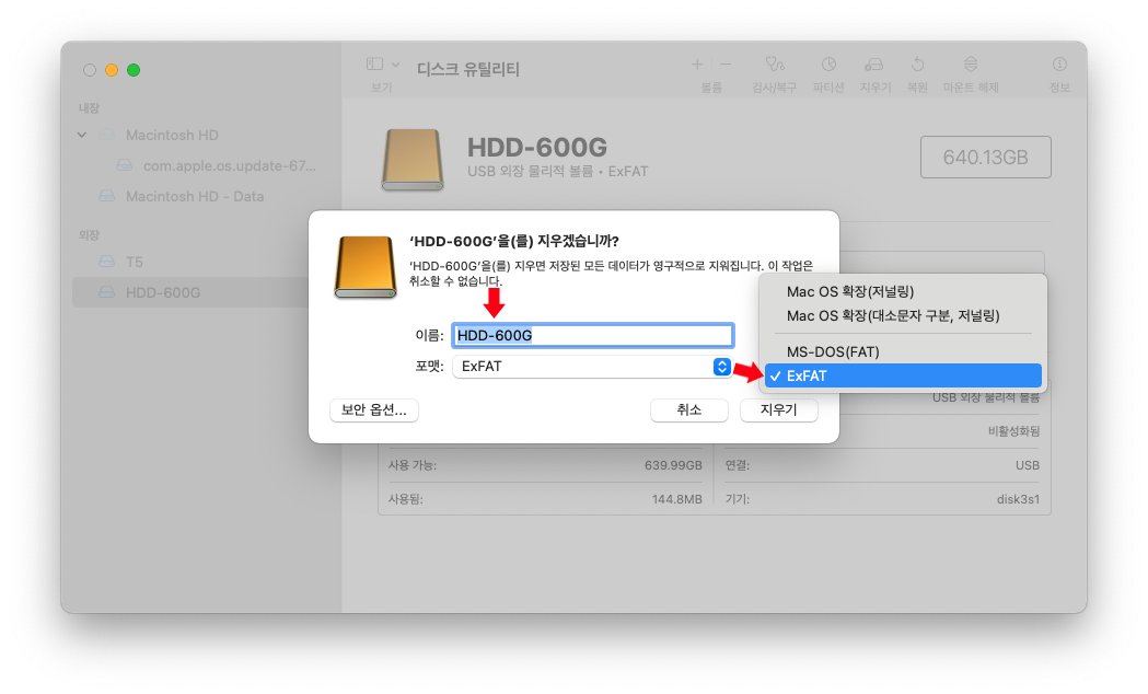- 디스크의 기본 데이터 시스템 형식을 선택하세요(Mac에서만 사용할 경우 APFS를 선택하는 것이 좋고, Windows 및 macOS 플랫폼에서 사용할 경우 ExFAT을 선택하세요).