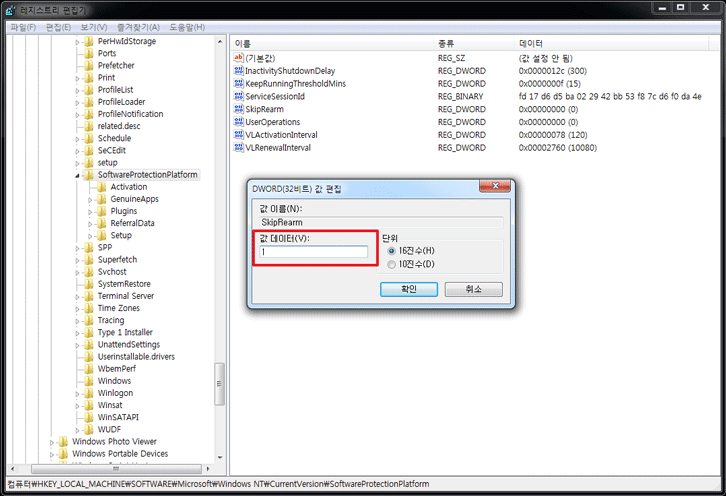 - SoftwareProtectionPlatform” 폴더에서 “SkipRearm” 항목을 찾고 더블 클릭하여 편집합니다.
