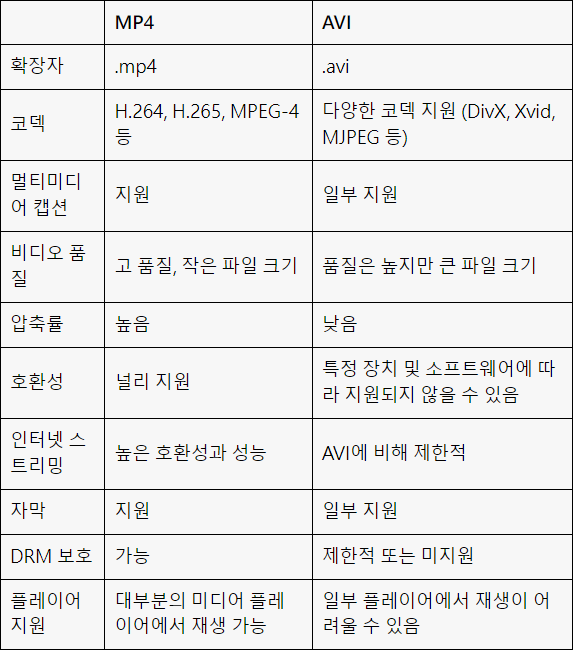 이 비교표를 통해 MP4와 AVI의 주요 차이점을 알 수 있습니다. MP4는 일반적으로 더 작은 파일 크기와 높은 압축률을 가지며, 널리 호환되고 인터넷 스트리밍에 적합합니다. 반면 AVI는 DVD 비디오 형식과 유사하며 주로 멀티미디어 디스크에 사용되며 TV, 영화 등 다양한 영상 정보를 저장하는 데 사용됩니다. 파일 크기가 크고 호환성이 상대적으로 낮을 수 있습니다.
