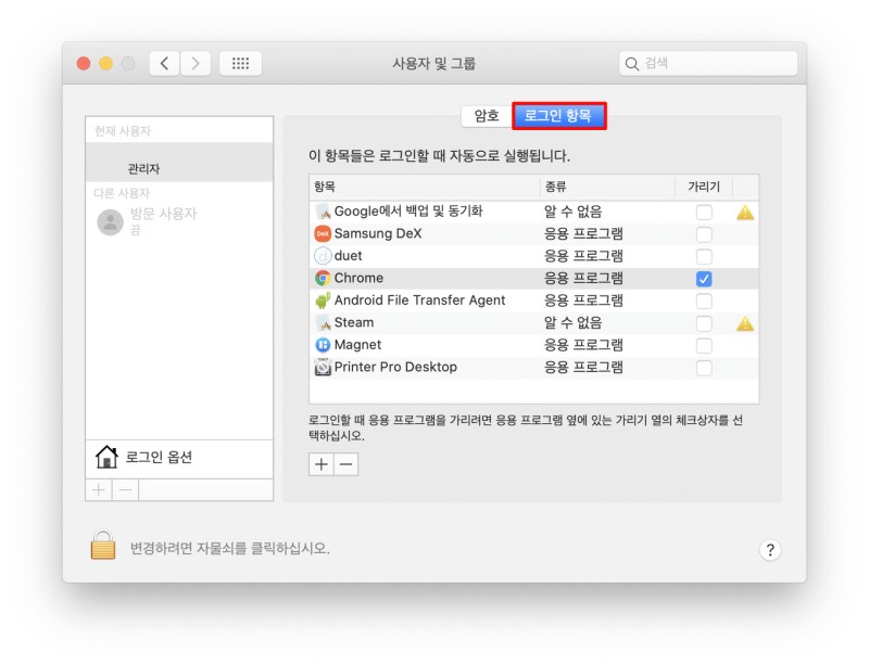 여러 개의 시작 프로그램이 있는 경우, 소프트웨어를 하나 제거할 때마다 컴퓨터를 재부팅해야 Mac 재부팅 문제를 일으키는 프로그램을 찾을 수 있습니다. 때로는 이러한 상황이 여러 소프트웨어로 인해 발생할 수도 있으므로 거의 모든 프로그램을 비활성화해야 할 수도 있습니다.