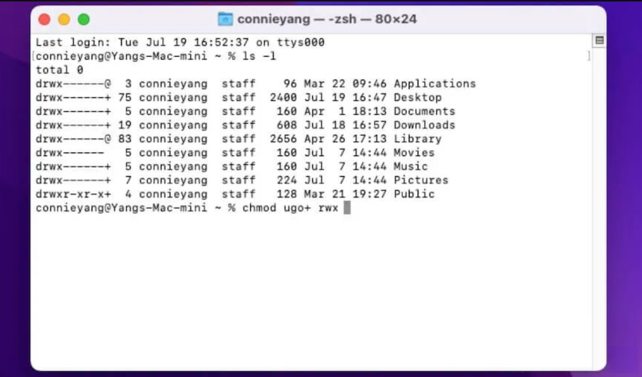 - 지금은 “chmod ugo+rwx “My Folder”” 명령을 실행하여 Mac 터미널에서 사용자, 그룹 및 기타 사용자의 읽기 및 쓰기 권한을 설정합니다.